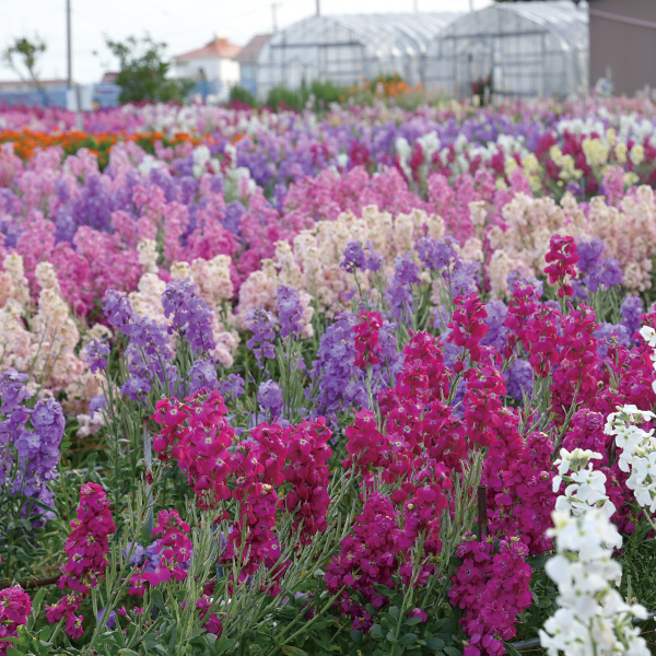9月の土壌作り、育苗から約3ヶ月後には色とりどりのストックとキンセンカが咲き始めます。春の足音が聞こえ始める3月には花の香りに包まれながら花摘みが楽しめます。これがこの地の春告花です。